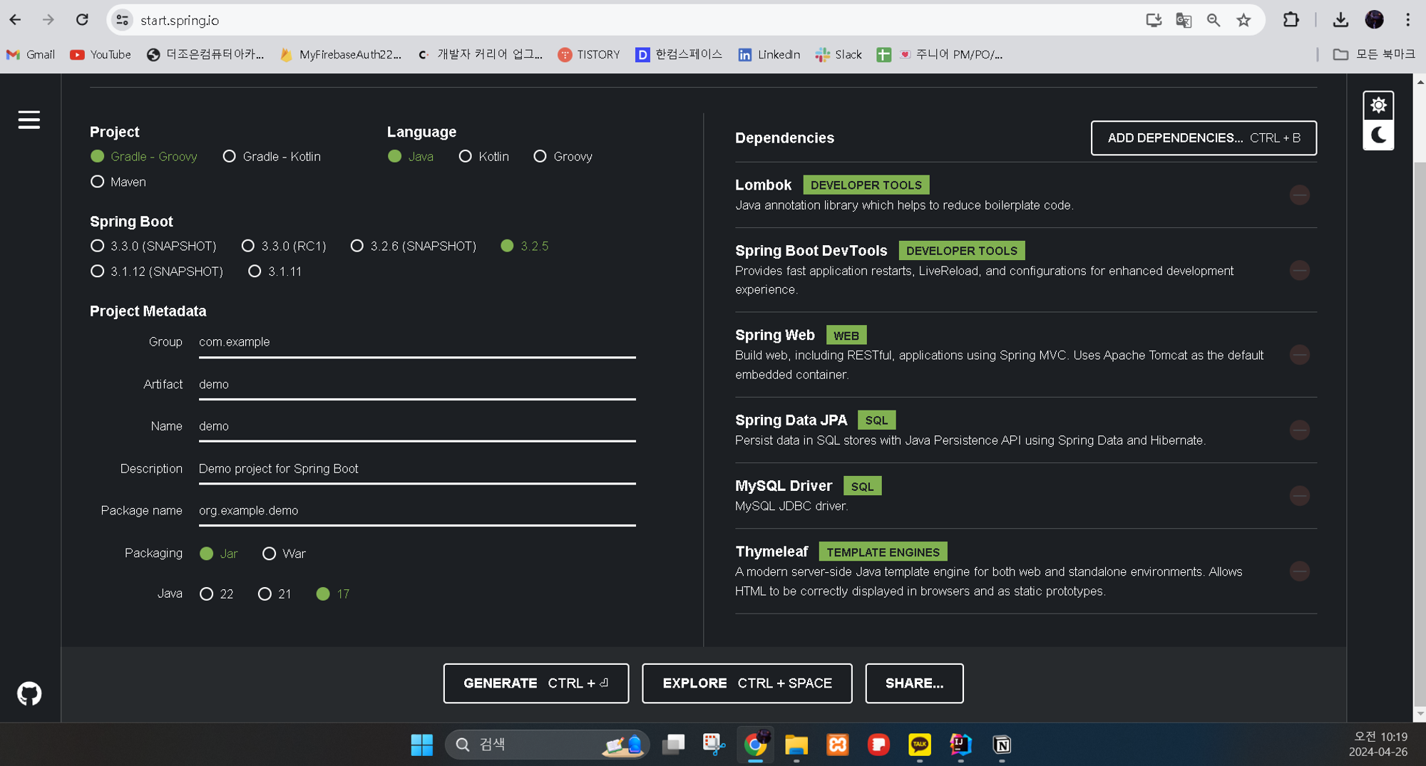 - Spring Boot 버전: 3.2.5 선택됨