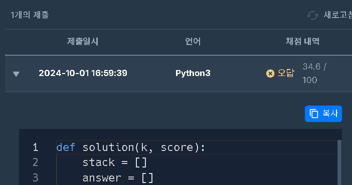 - k일 이후에는 stack에서 가장 낮은 score을 빼는 것으로 이해하고 (제발 글부터 제대로 읽자!!! 👿👿) elif문을 짰는데 stack 마지막 값보다 큰 값이 들어오면 점수를 바꿔달라는 요구사항을 넣었다.
