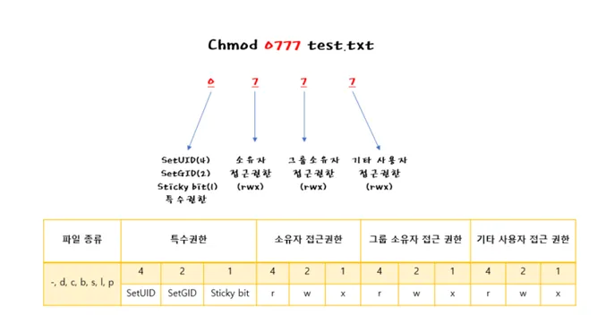 - 1777 (rwxrwxrwt): Sticky Bit가 설정된 공유 디렉토리