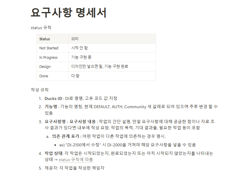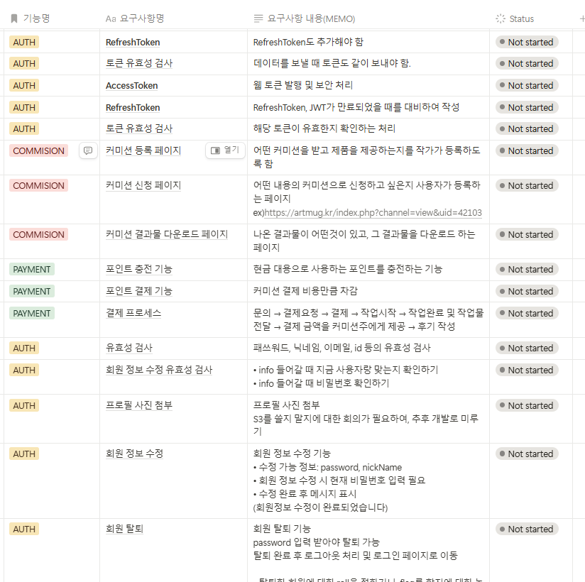 이 두 가지를 목표로, 각자 Notion에 요구사항 명세서를 정리하기로 했습니다. 그 결과... 🫠 요구사항이 너무 많아 보이더라고요.