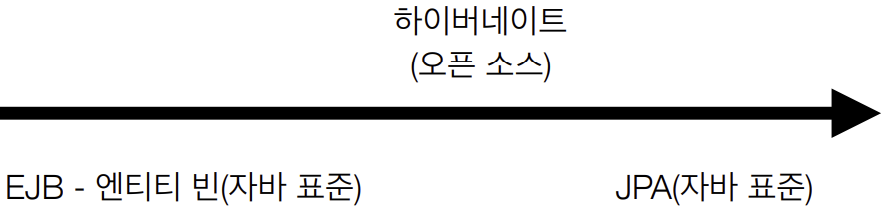- 옛날 EJB 엔티티 빈은 쓰기 어렵고 느렸어요 → 실무자들이 만든 오픈소스 Hibernate가 대세가 되었어요