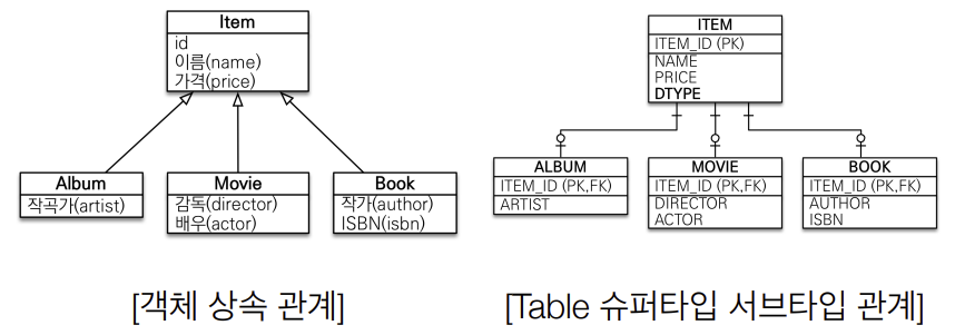 객체에는 상속 관계가 존재하지만, DB 테이블엔 객체에서 생각할 수 있는 상속 관계는 없어요.