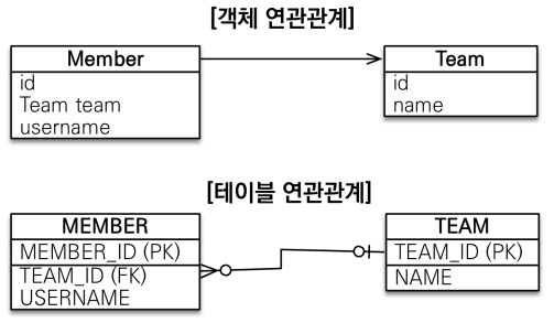 객체는 참조를 사용해 연관 관계를 맺어요. 그에 비해 테이블은 외래 키로 테이블을 조인해 연관 관계를 맺습니다