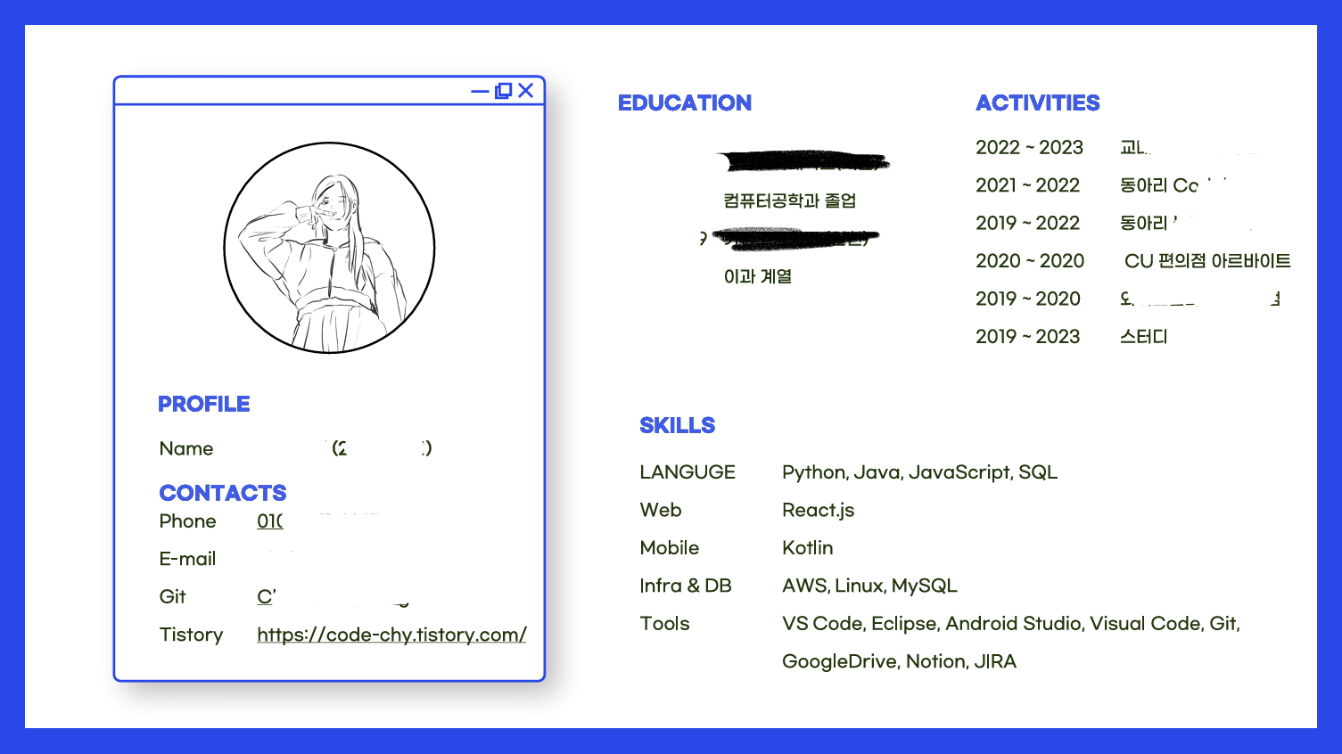 사실상 기업에서 가장 먼저 보는 내용이기도 하고, 신입 개발자에게는 "내가 어떤 사람인지"를 짧게 보여줄 기회라서 꽤 공들였어요.