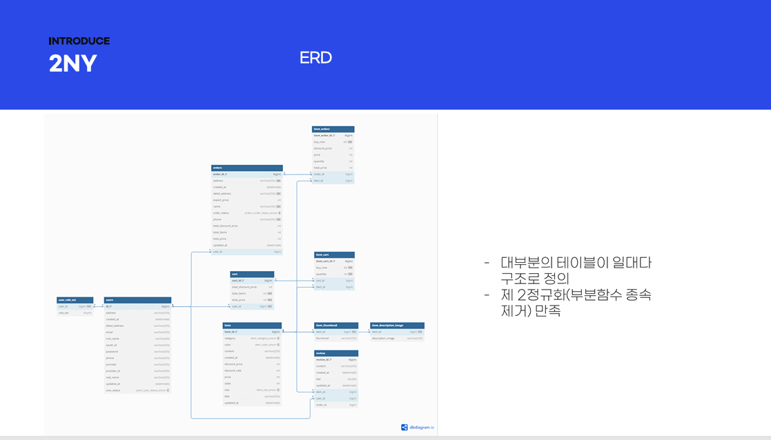 👉 ERD를 만들고, 정규화 과정을 설명할 수 있도록 했습니다. - 대부분의 테이블은 제2 정규화 수준까지 맞췄고,