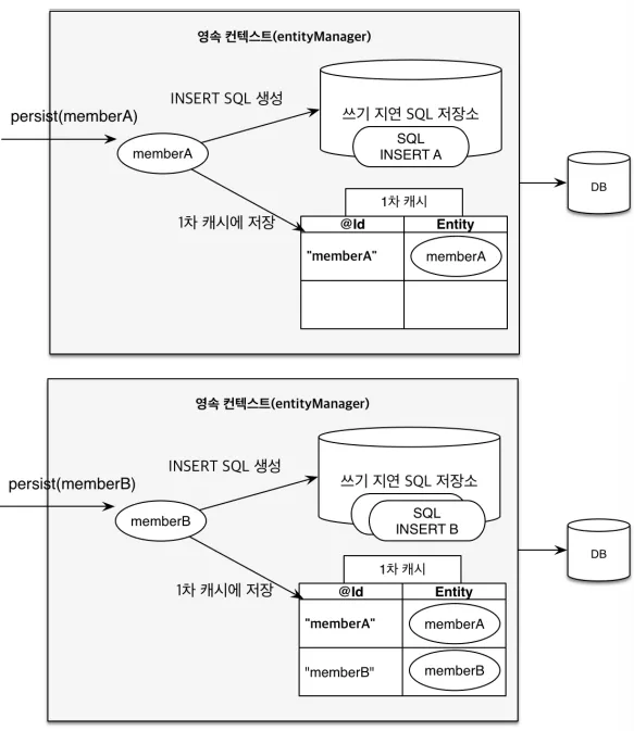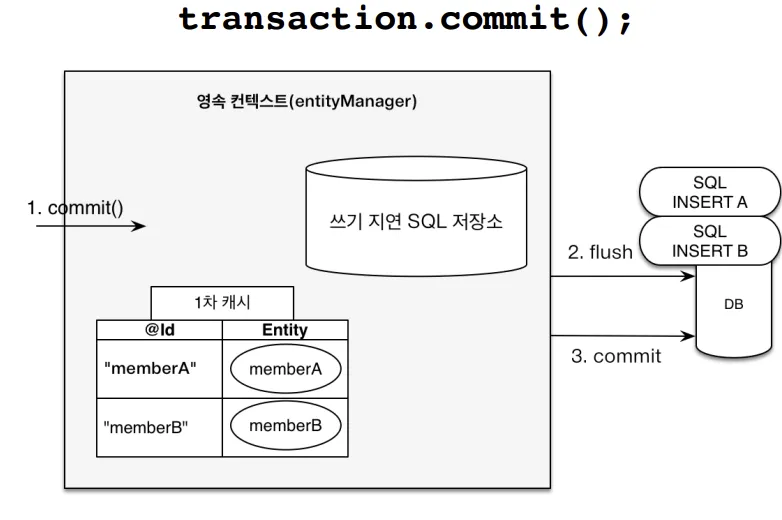 JPA는 em.persist()나 em.remove() 같은 메서드를 호출해도 바로 SQL을 실행하지 않아요. 내부에 있는 쓰기 지연 저장소에 모아두었다가, 트랜잭션 커밋 시점에 한 번에 실행합니다.