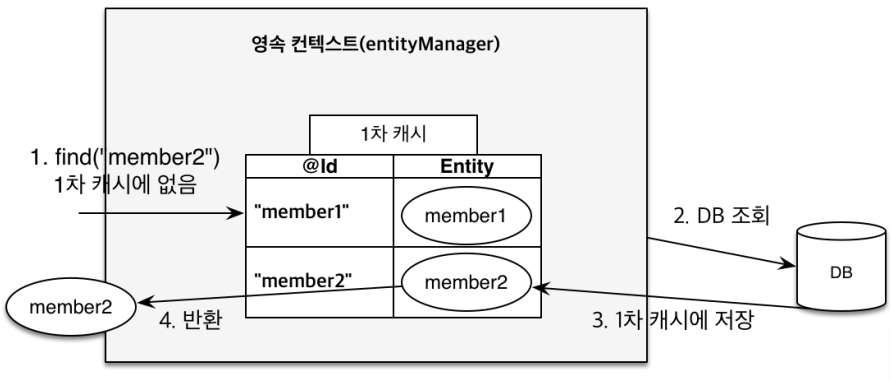 Member findMember = em.find(Member.class, "member1"); // 1차 캐시 hit!