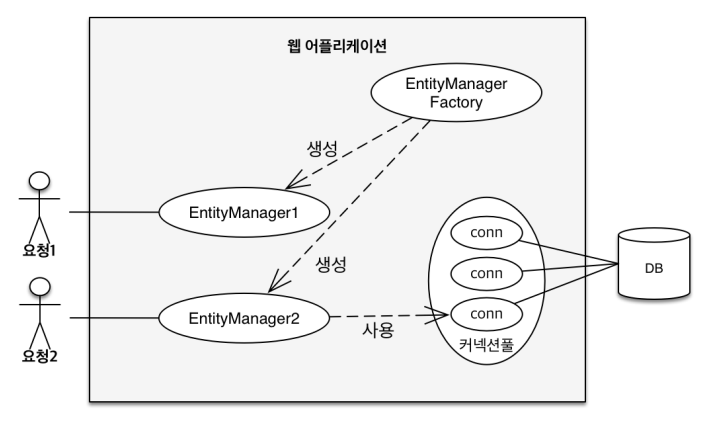 EntityManagerFactory는 이름 그대로 엔티티 매니저를 만드는 공장이에요 여러 스레드가 동시에 접근해도 안전하므로 서로 다른 스레드 간에 공유해도 되지만 엔티티 매니저는 여러 스레드가 동시에 접근하면 동시성 문제가 발생하므로 스레드 간에 절대 공유하면 안돼요!