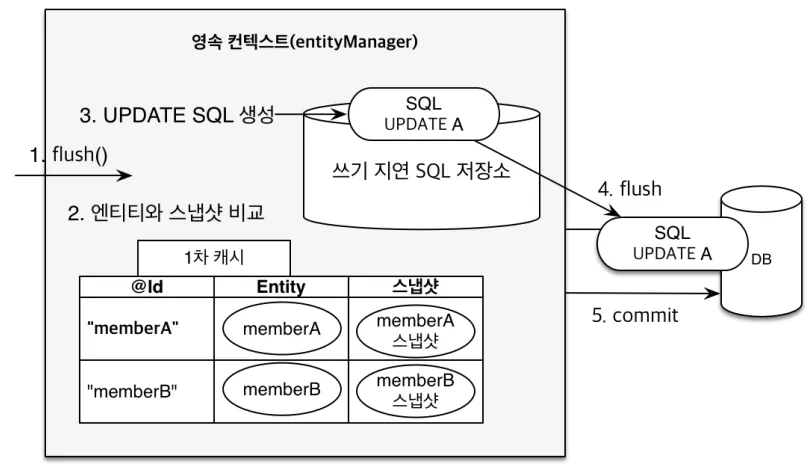 - 위에서 말한 변경 감지(Dirty Checking)가 발생하고, 수정된 엔티티를 쓰기 지연 SQL 저장소에 등록해요. 이후 쓰기 지연 SQL 저장소의 쿼리를 DB에 전송해요. 이후 트랜잭션이 커밋됩니다.