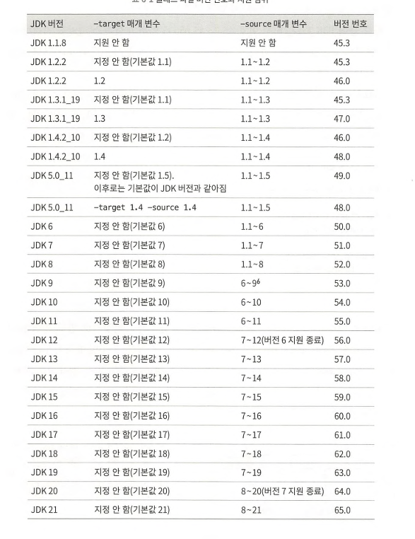 - 버전: 상위 버전 JDK는 하위 버전의 클래스 파일을 인식할 수 있지만, 하위 버전 JDK는 상위 버전의 클래스 파일을 실행할 수 없습니다. (예: JDK 17은 메이저 버전 61에 해당합니다).