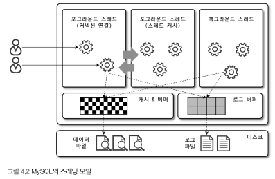 - 리드 어헤드(Read Ahead): InnoDB는 풀 스캔 시 성능 향상을 위해 연속된 데이터 페이지가 읽히면 백그라운드 스레드를 통해 미리 최대 64개의 페이지를 읽어 버퍼 풀에 적재하는 '리드 어헤드' 기능을 실행합니다.