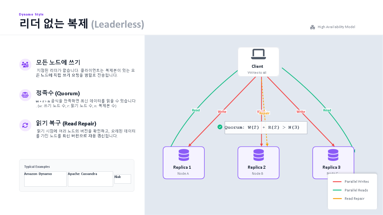 아마존 다이나모(Dynamo) 스타일의 시스템이 리더 없이도 어떻게 가용성을 극대화하는지 다룹니다.
