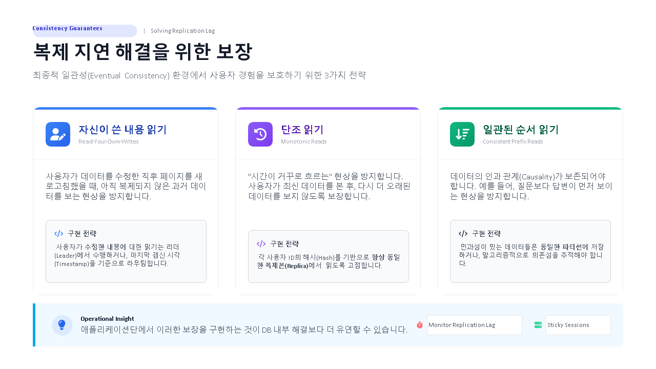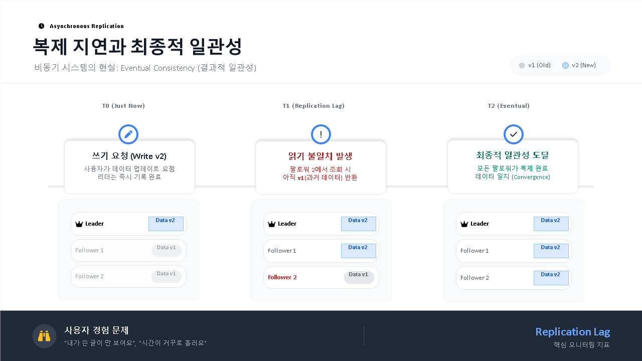 비동기 복제에서 발생하는 복제 지연(Replication Lag) 문제를 사용자 경험 측면에서 심도 있게 다룹니다.