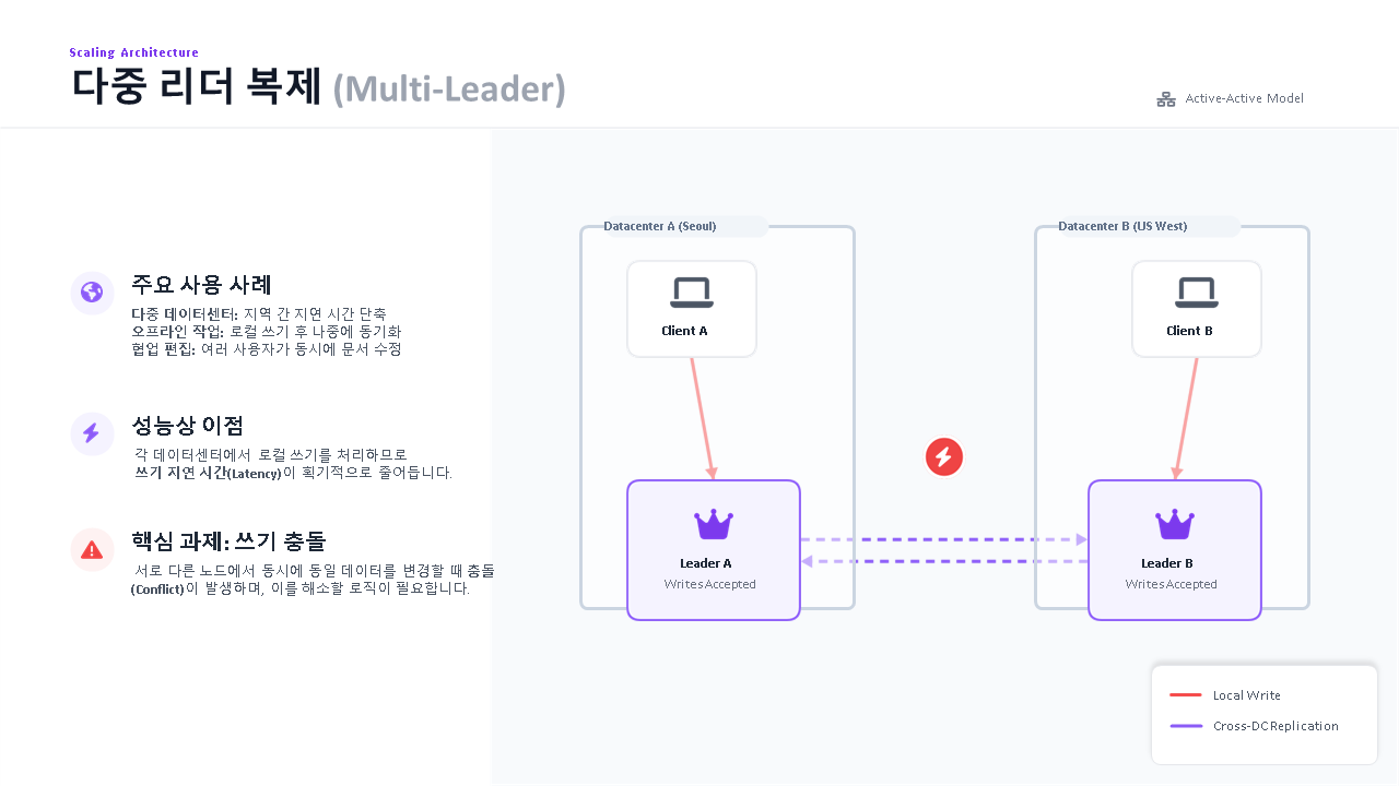 N개 (보통 DC당 1개) | Aurora Multi-Writer, CouchDB | 쓰기 확장 가능하지만 충돌 해소 필요 |