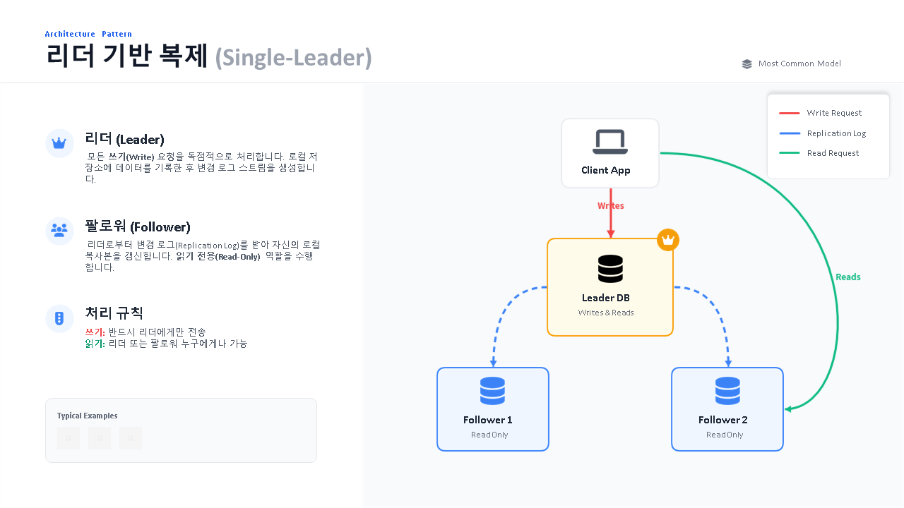 단일 리더 복제(Single-Leader Replication) 는 가장 일반적인 복제 방식입니다. 핵심 원리는 단순합니다:
