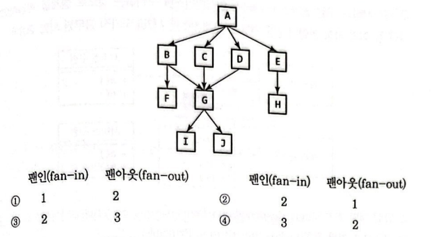 6-9 다음은 소프트웨어의 구성 요소인 모듈의 계층적 구성을 나타내는 프로그램 구조도이다. 모듈 G에서 펜인(fan-in)과 팬 아웃(fan-put)은? 9. ④