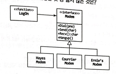 6-12 그림과 같이 서비스 구현 클래스의 a(), b() 연산을 사용하는 클라이언크 클래스가 서비스 구현 클래스에 직접 의존하는 관계에서 클라이언트 클래스가 서비스 인터페이스에 의존하고 서비스 구현 클래스는 서비스 인터페이스를 구현하는 것으로 설계를 번경하였다. 다음중 이와 가장 관련이 깊은 SOULD 설계원칙은? 12. ③
