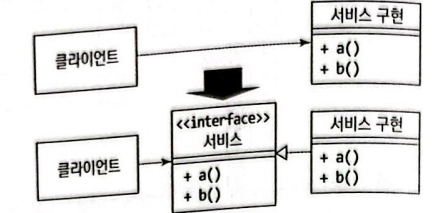 - 의존 관계 역전(Dependency Inversion) 원칙: 클라이언트는 자신이 사용하는 메소드와 의존 관계를 갖지 않도록 해야 한다.