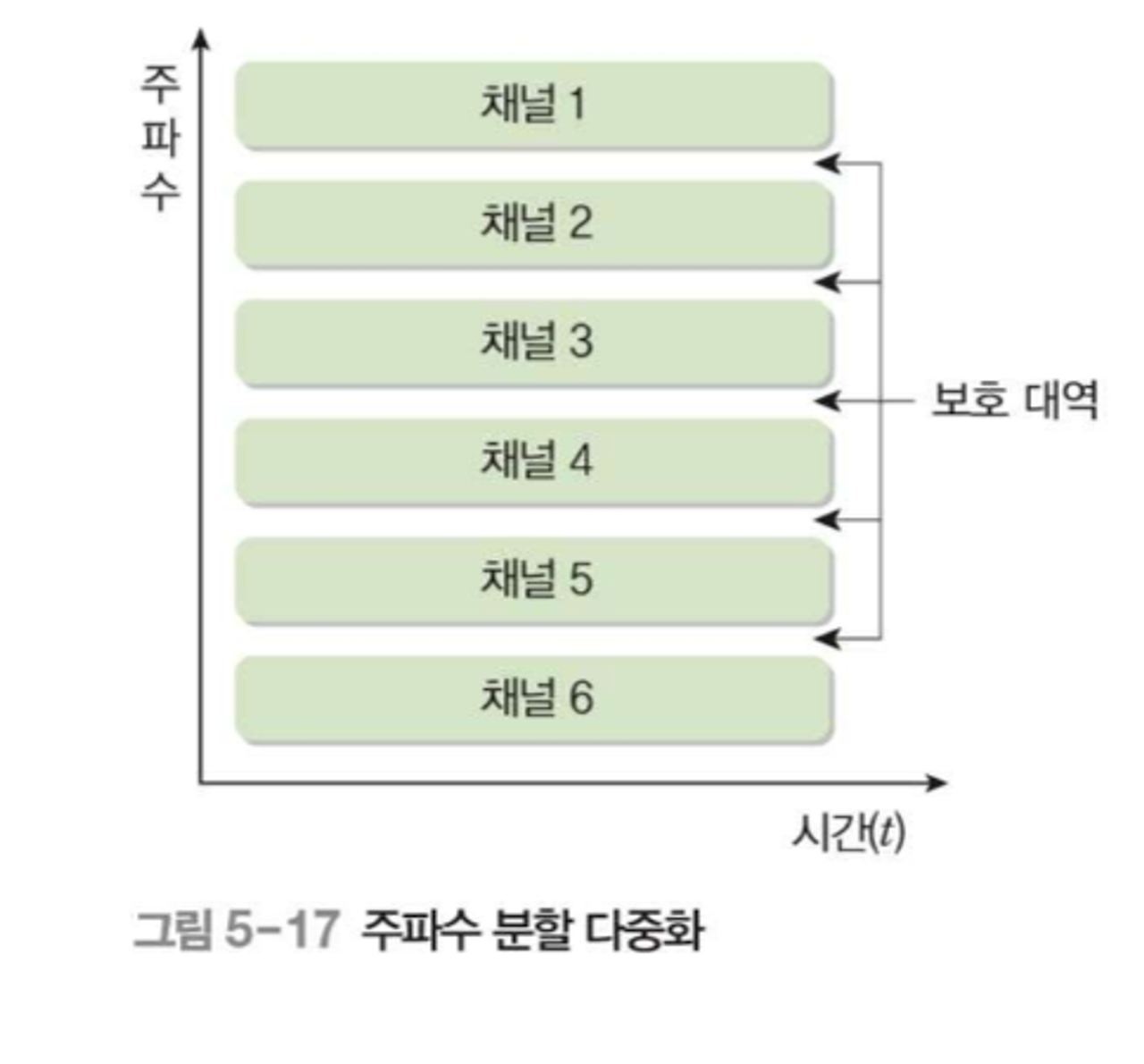 - 데이터 링크의 주파수 대역폭을 몇 개의 작은 주파수 대역으로 나누어 각각 부채널로 재구성하여 각 디바이스로부터 나오는 신호를 동시에 전송하는 방식