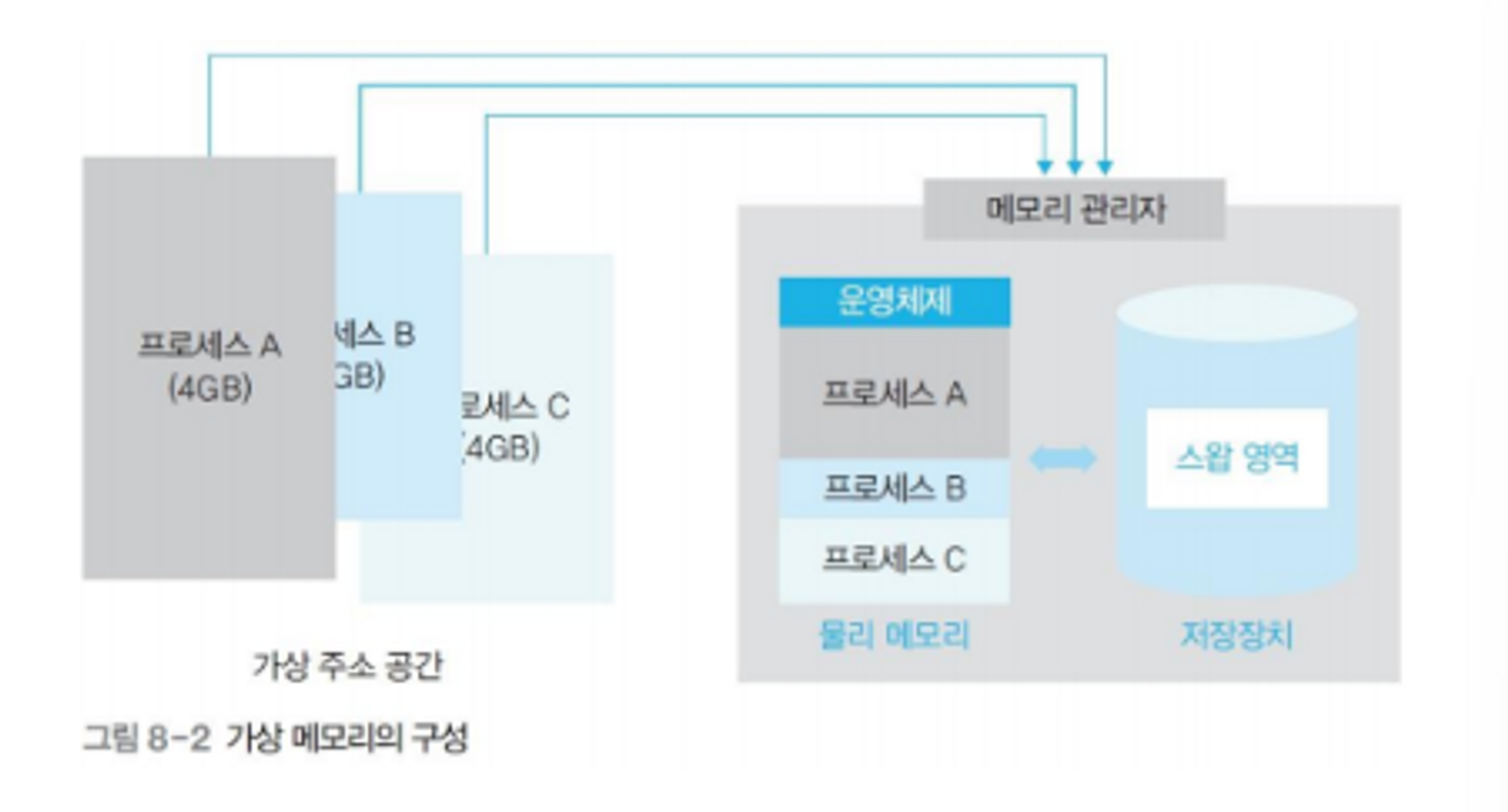 - 가상 메모리에서 메모리 관리자는 물리 메모리의 부족한 부분을 스왑 영역으로 보충