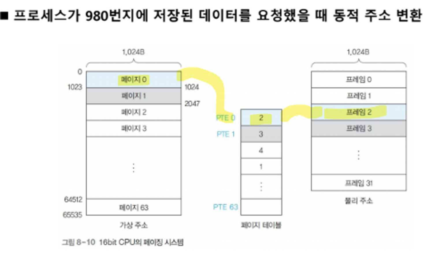 - 가상 주소로 사용할 수 있는 16bit 중 6bit는 페이지 번호로,(P) 10bit는 페이지의 처음 위치에(D)서 해당 주소까지의 거리