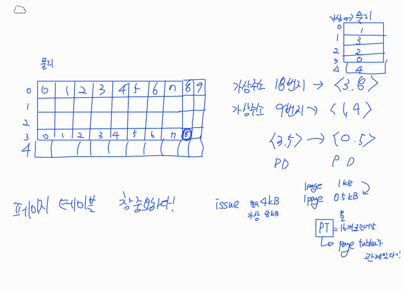 - 가상 메모리 시스템에서 메모리 관리자는 가상 주소와 물리 주소를 일대일 매핑 테이블로 관리