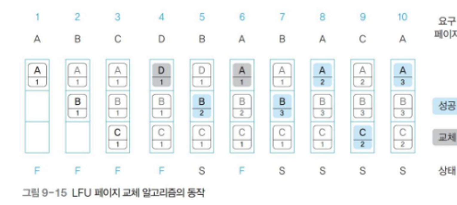 - LFU(Least Frequently Used) 페이지 교체 알고리즘: 페이지가 사용된 횟수를 기준으로 대상 페이지 선정