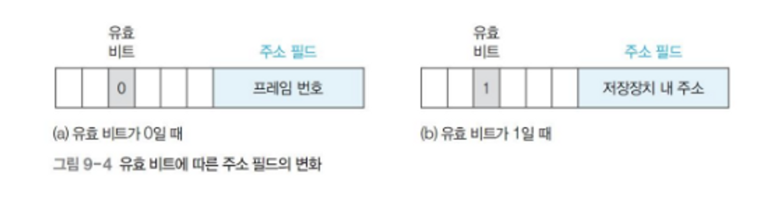 - 유효 비트가 0: 페이지가 메모리에 있으므로 주소 필드에 물리 메모리의 프레임 번호 저장
