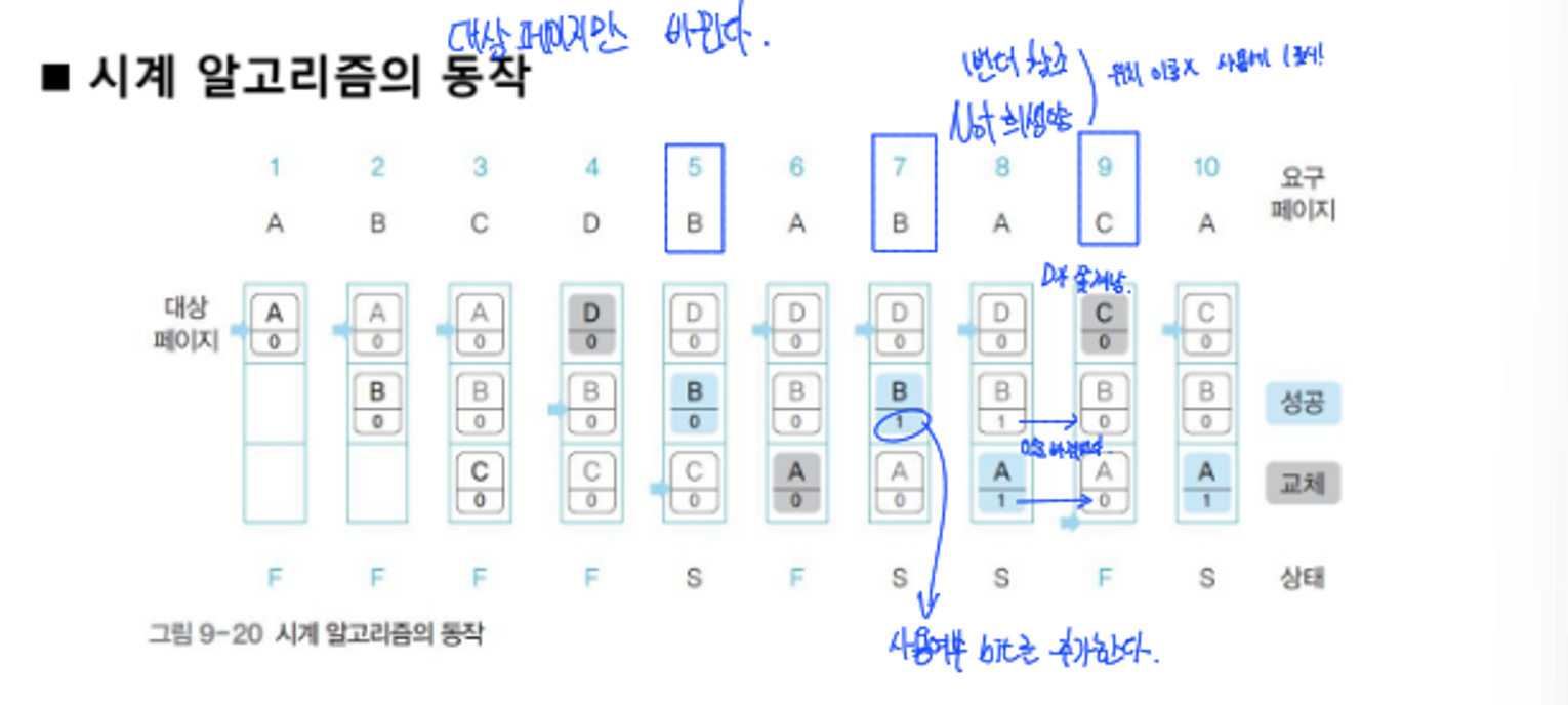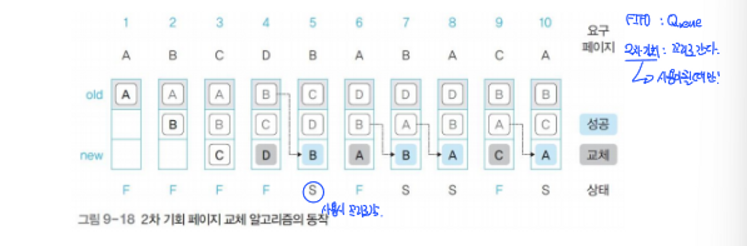 - 가리키는 페이지가 스왑 영역으로 쫓겨 나면 대상 포인터를 밑으로 이동, 이때 참조 비트가 1인 페이지는 0으로 만든 후 건너 뜀(2차 기회를 줌