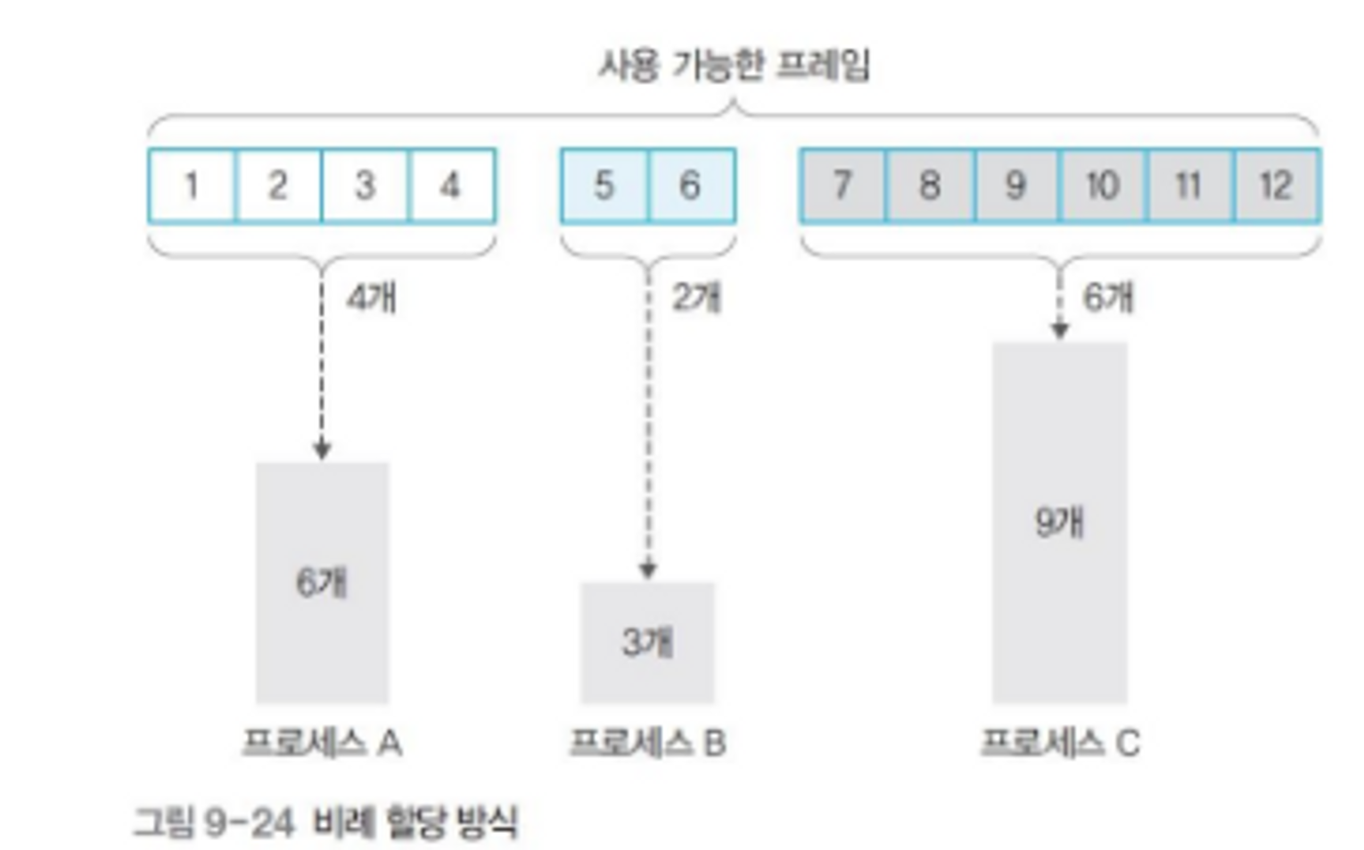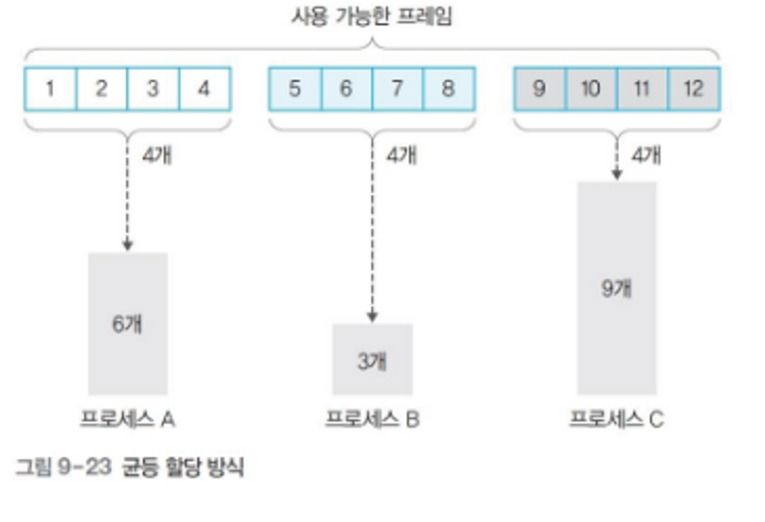 - 프로세스 크기와 상관없이 사용 가능한 프레임을 모든 프로세스에 동일하게 할당
