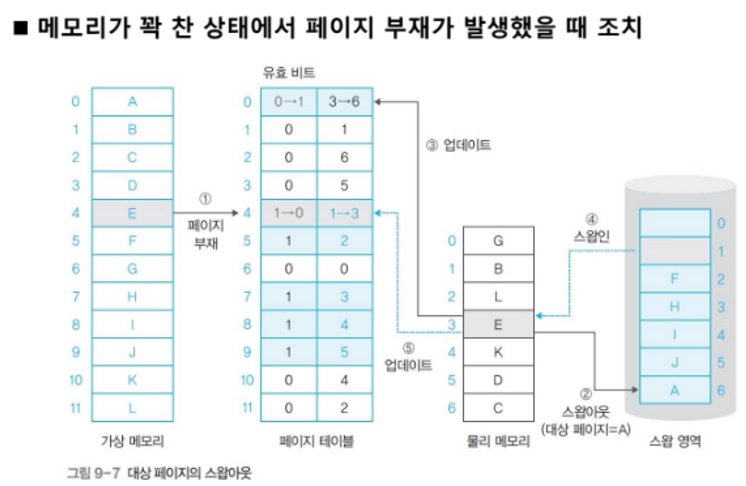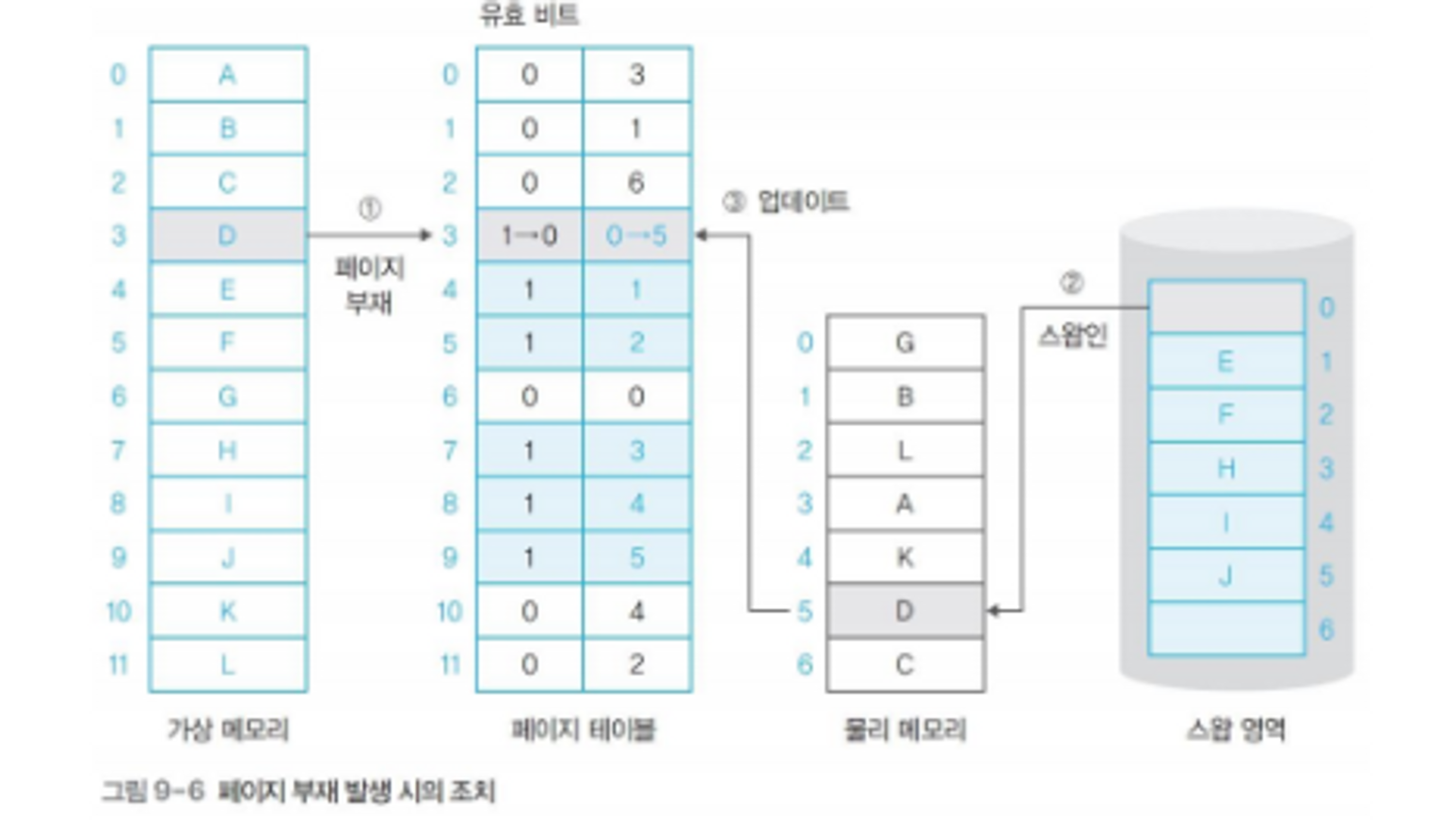 - 페이지 부재가 발생하면 스왑 영역에 있는 페이지를 메모리의 빈 영역에 올리고 페이지 테이블 갱신(업데이트)