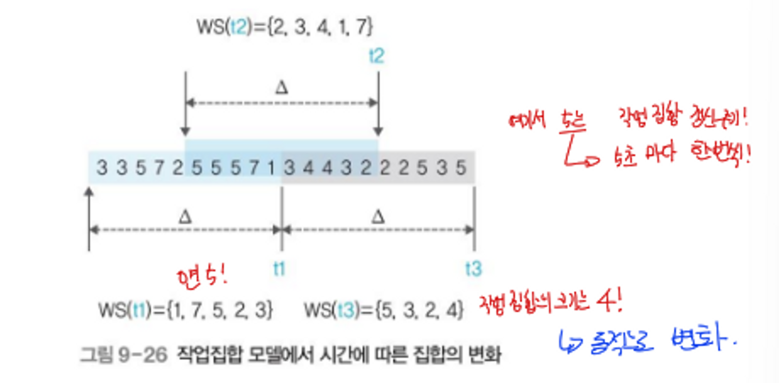 - 작업집합 윈도우(wsw; Working Set Window): 작업집합에 포함되는 페이지 범위