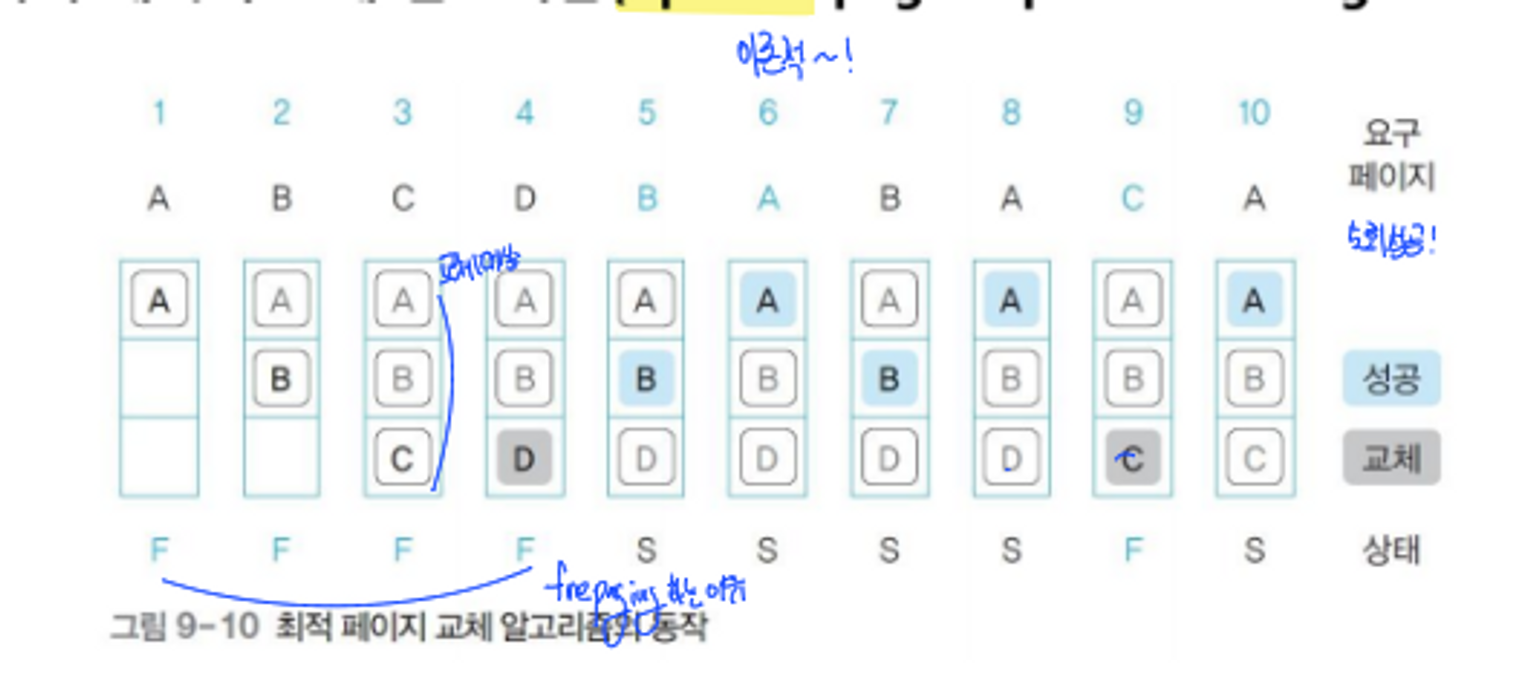 - 메모리가 앞으로 사용할 페이지를 미리 살펴보고 페이지 교체 선정 시점부터 사용 시점까지 가장 멀리 있는 페이지를 대상 페이지로 선정