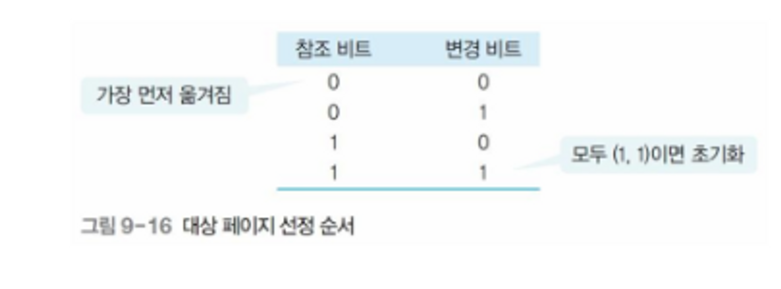 - 대상 페이지 찾을 때 참조 비트가 0인 페이지를 먼저 찾고, 없으면 변경 비트가 0인 페이지를 찾음