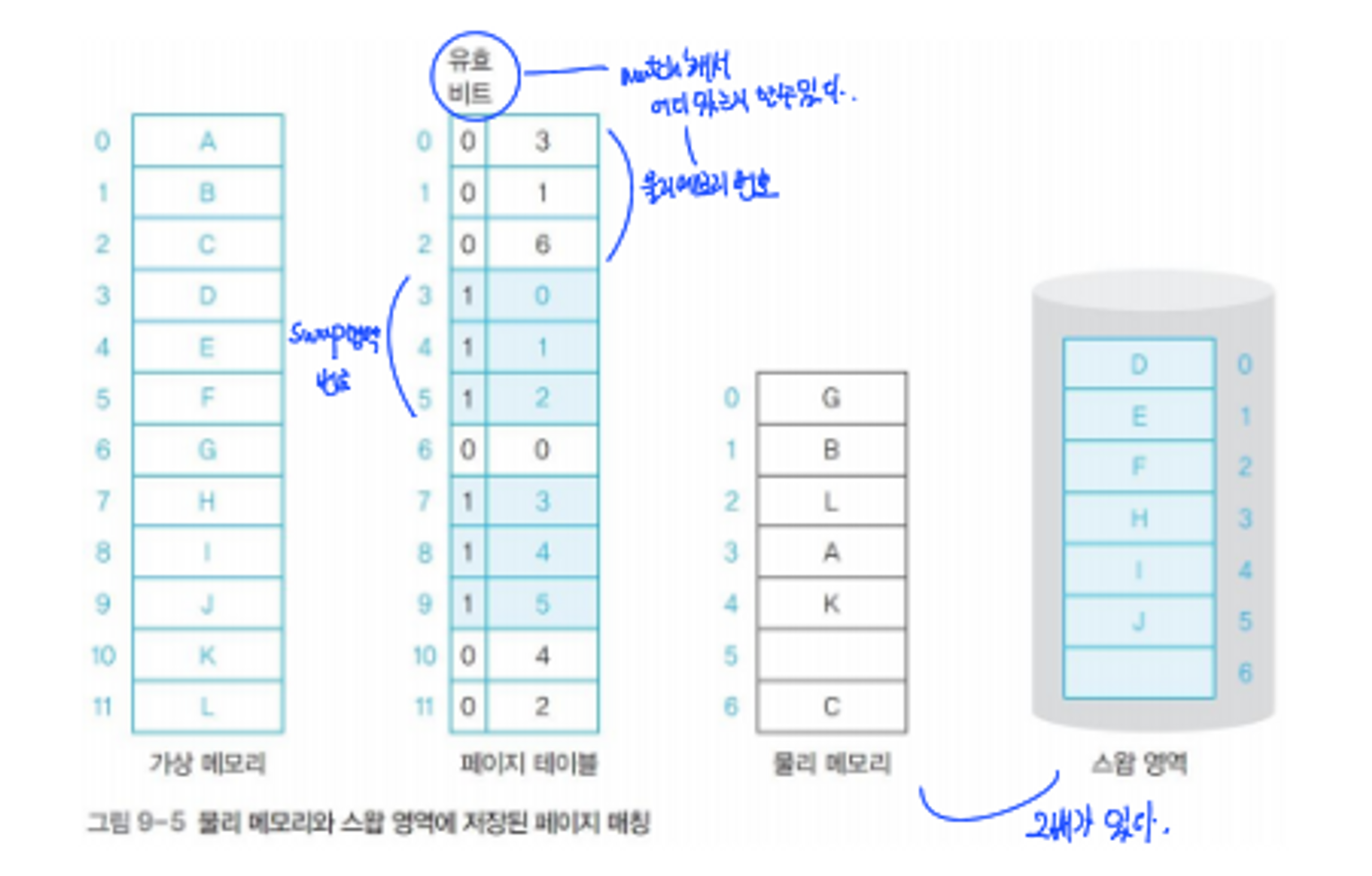 - 유효 비트가 1: 페이지가 스왑 영역에 있으므로 주소 필드에 스왑 영역 내 페이지 주소 저장