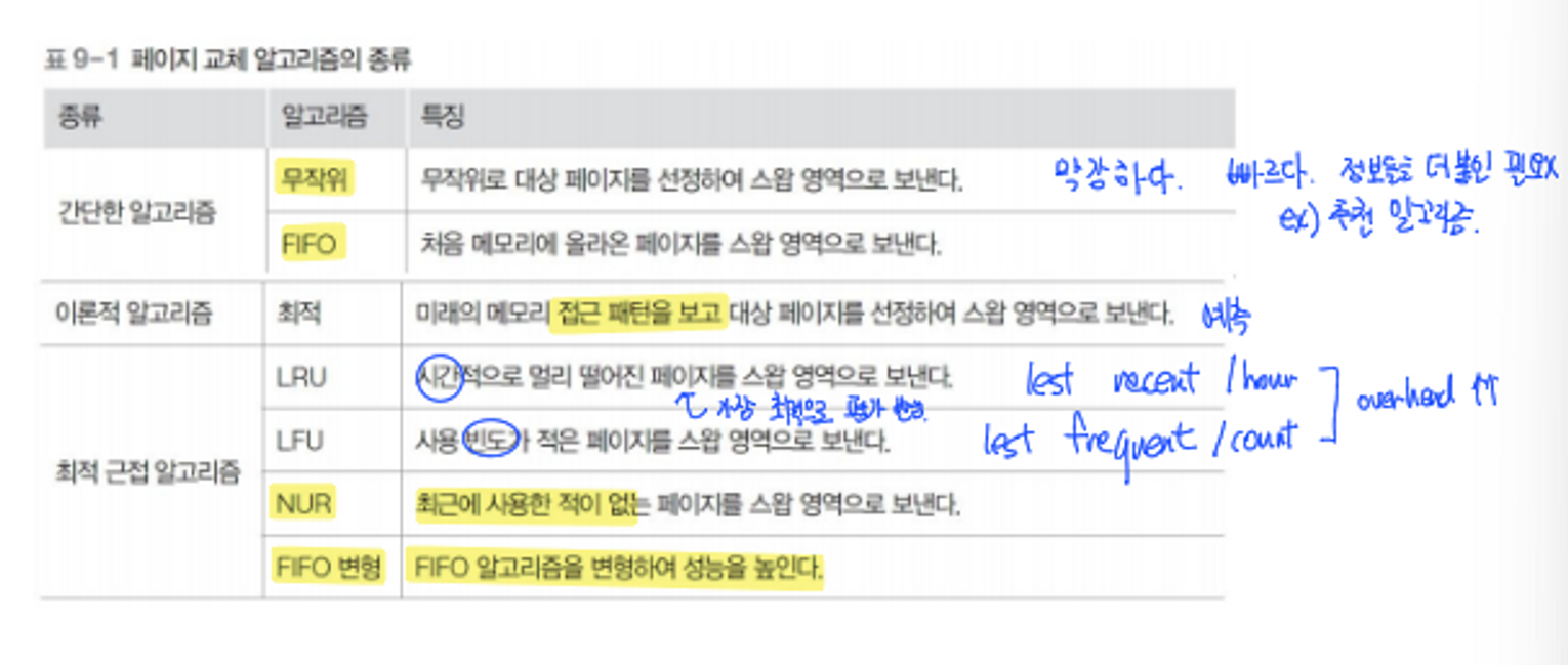 - 어떤 페이지를 스왑 영역으로 내보낼지 결정하는 알고리즘