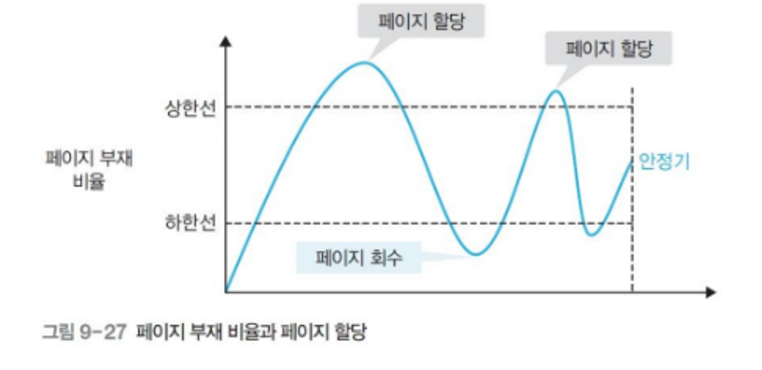 - 페이지 부재 비율이 하한선 밑으로 내려가면 할당한 프레임을 회수