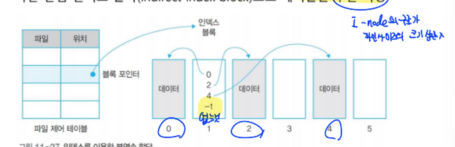 - 테이블이 꽉 차서 더 이상 데이터를 연결할 수 없을 때는 인덱스 블록을 연결하는 간접 인덱스 블록(indirect index block)으로 테이블을 무한 확장