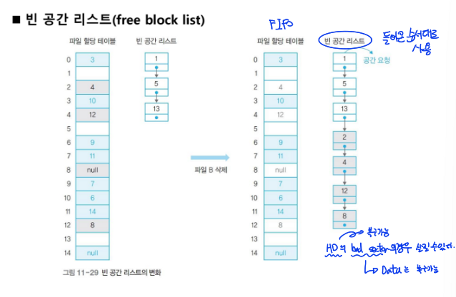 - 파일 시스템은 디스크의 내부 단편화를 줄이고 빈 공간을 효율적으로 관리하기 위해 빈 블록의 정보만 모아놓은 빈 공간 리스트를 유지