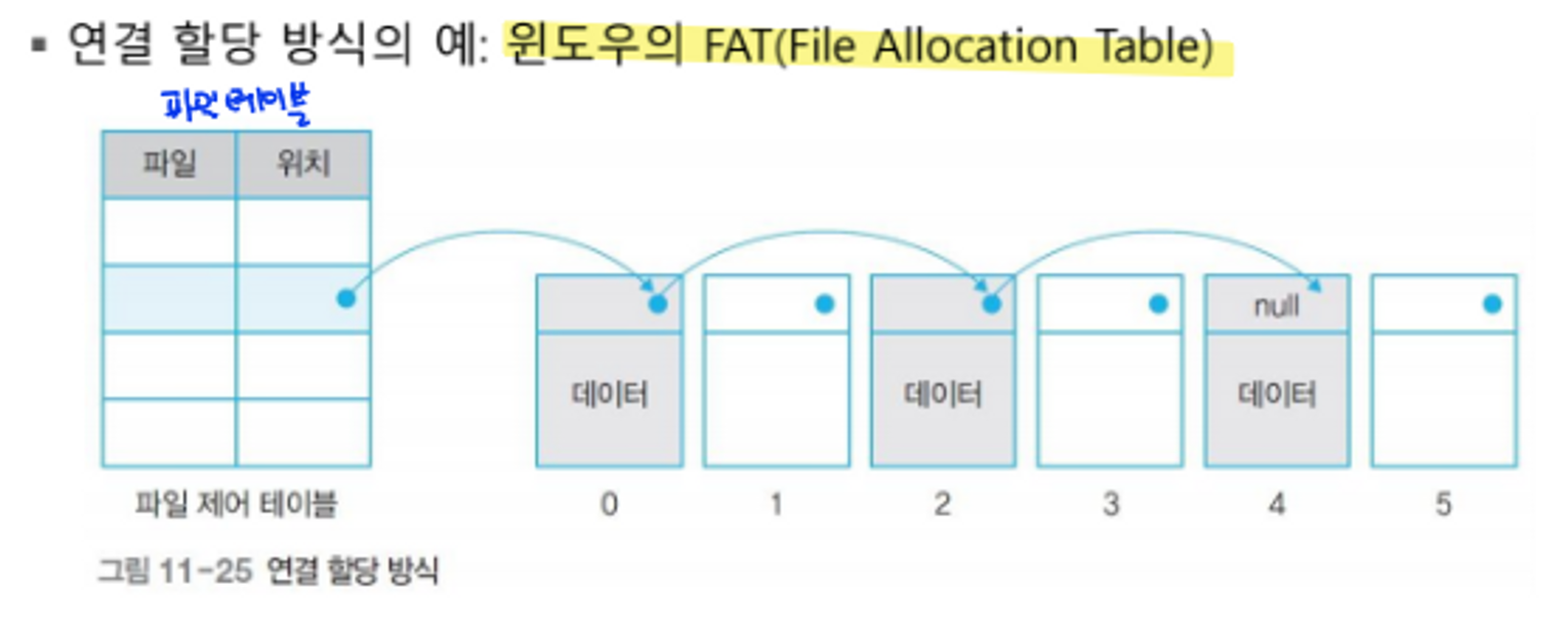 - 연결 할당 방식의 예: 윈도우의 FAT(File Allocation Table)