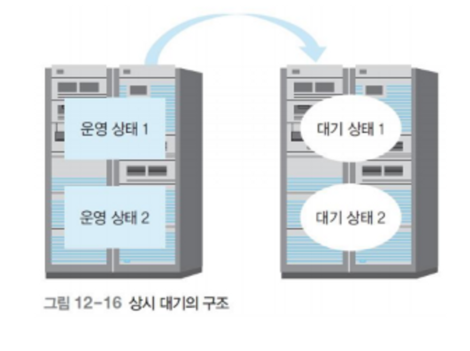 - 평상시에 대기 상태(standby) 유지하다가 장애 발생하면 가동 시스템의 자원을 백업 시스템으로 이전하여 서비스가 중단되지 않게 함