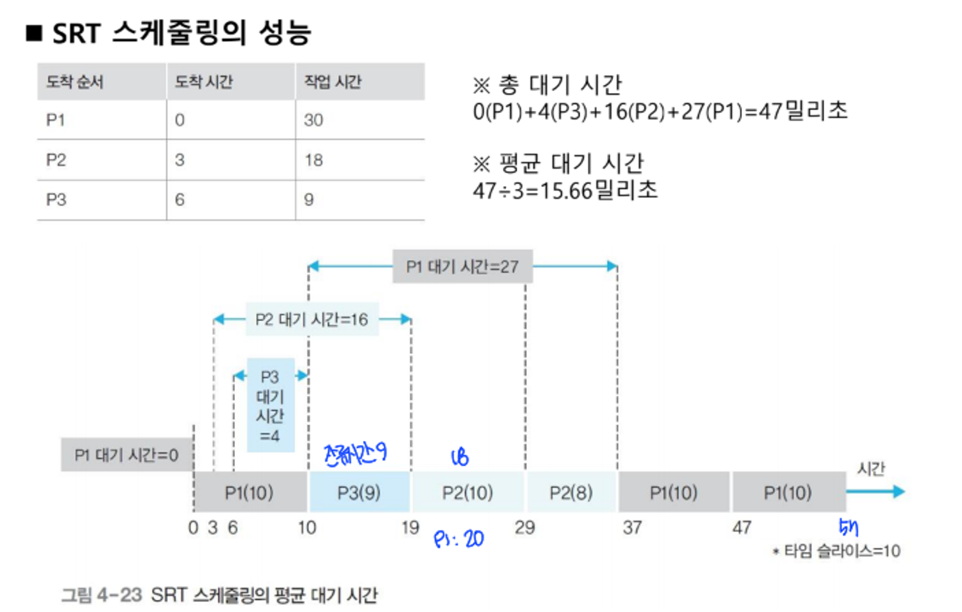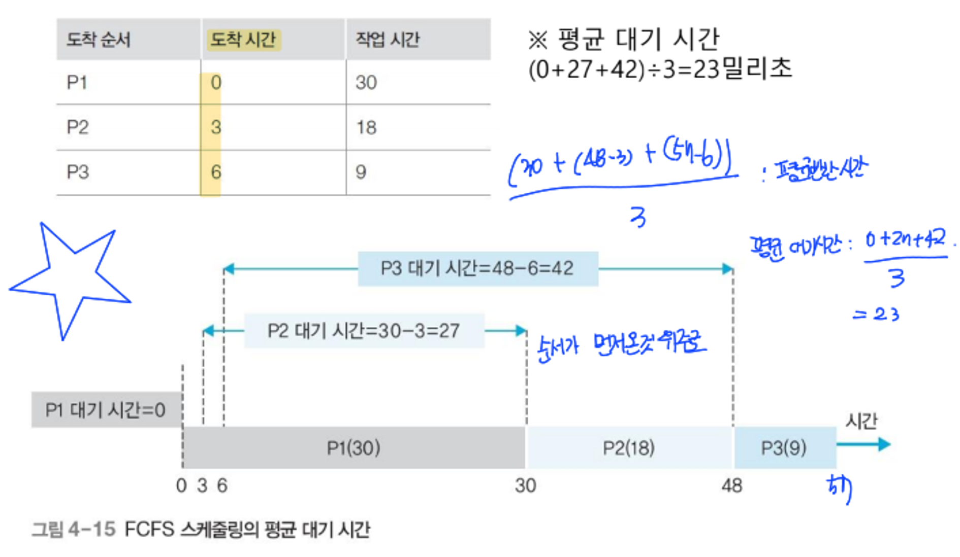 - 평균 대기 시간: 모든 프로세스의 대기 시간을 합한 뒤 프로세스의 수로 나눈 값