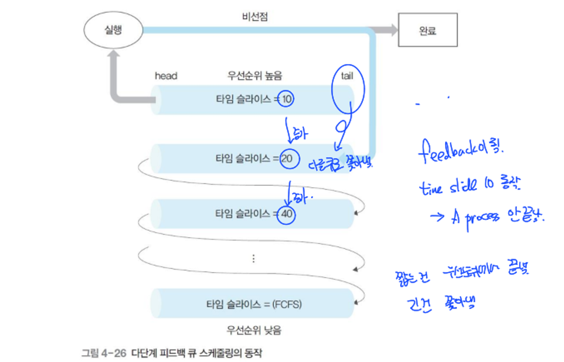 - 우선순위가 낮아지더라도 커널 프로세스가 일반 프로세스의 큐에 삽입되지 않음