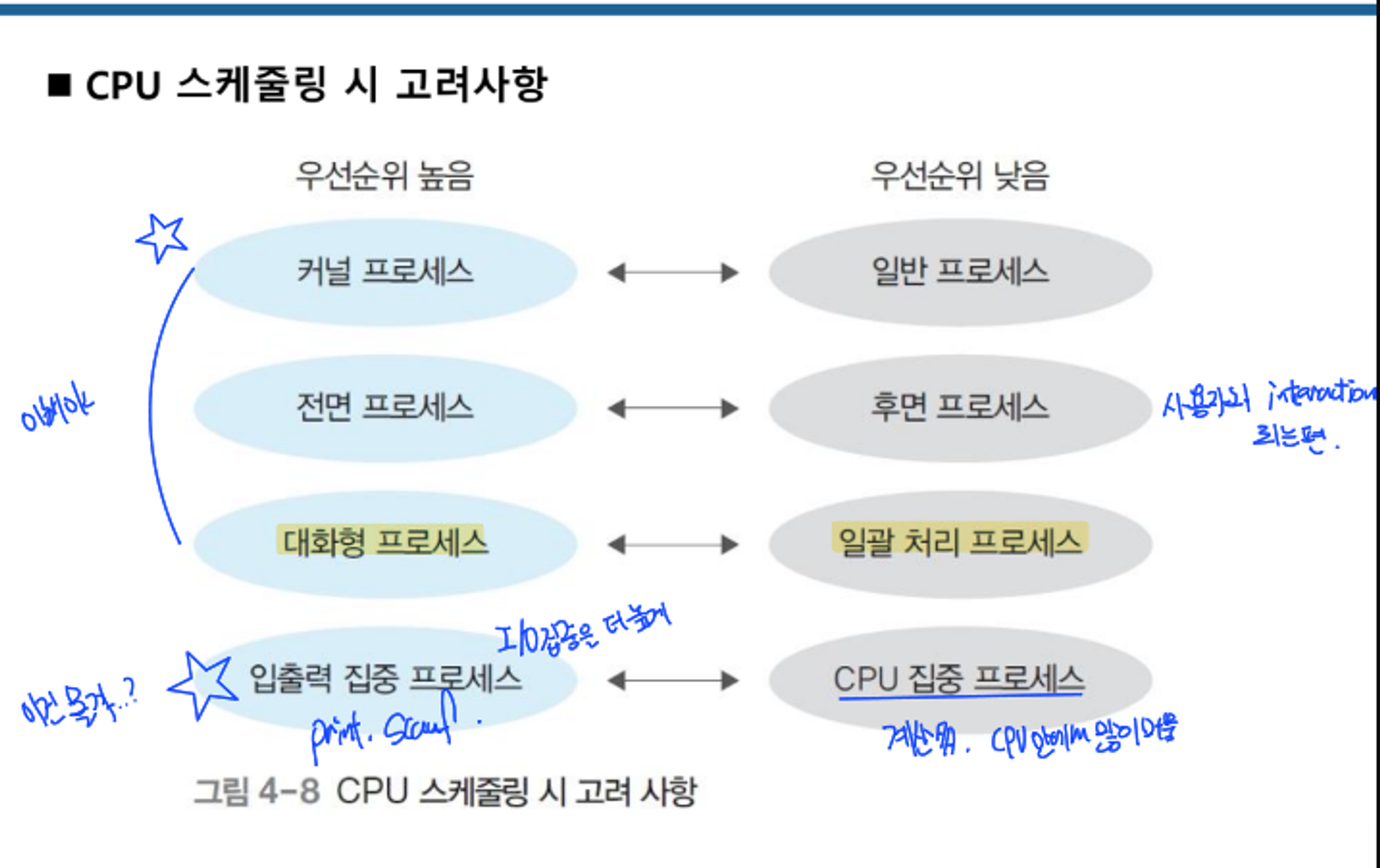 - 시스템에는 다양한 우선순위의 프로세스가 공존하며 우선순위가 높은 프로세스가 CPU를 먼저, 더 오래 차지