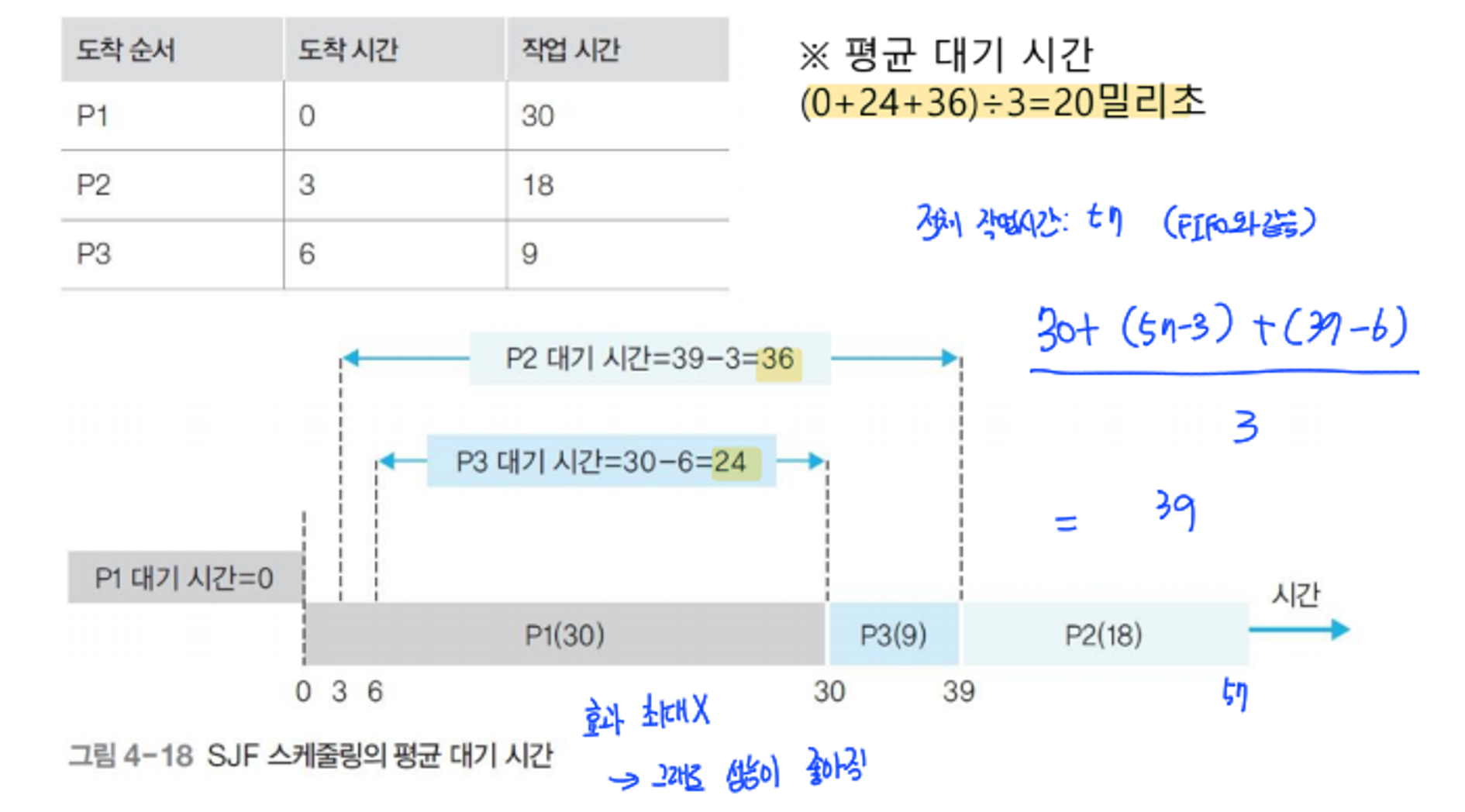 - (비선점형 방식) SJF 스케줄링 : 작업 시간이 짧은 프로세스에 높은 우선순위를 부여
