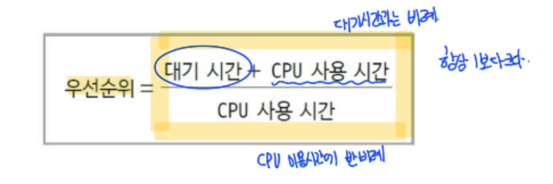 - 서비스를 받기 위해 기다린 시간과 CPU 사용 시간을 고려하여 스케줄링을 하는 방식