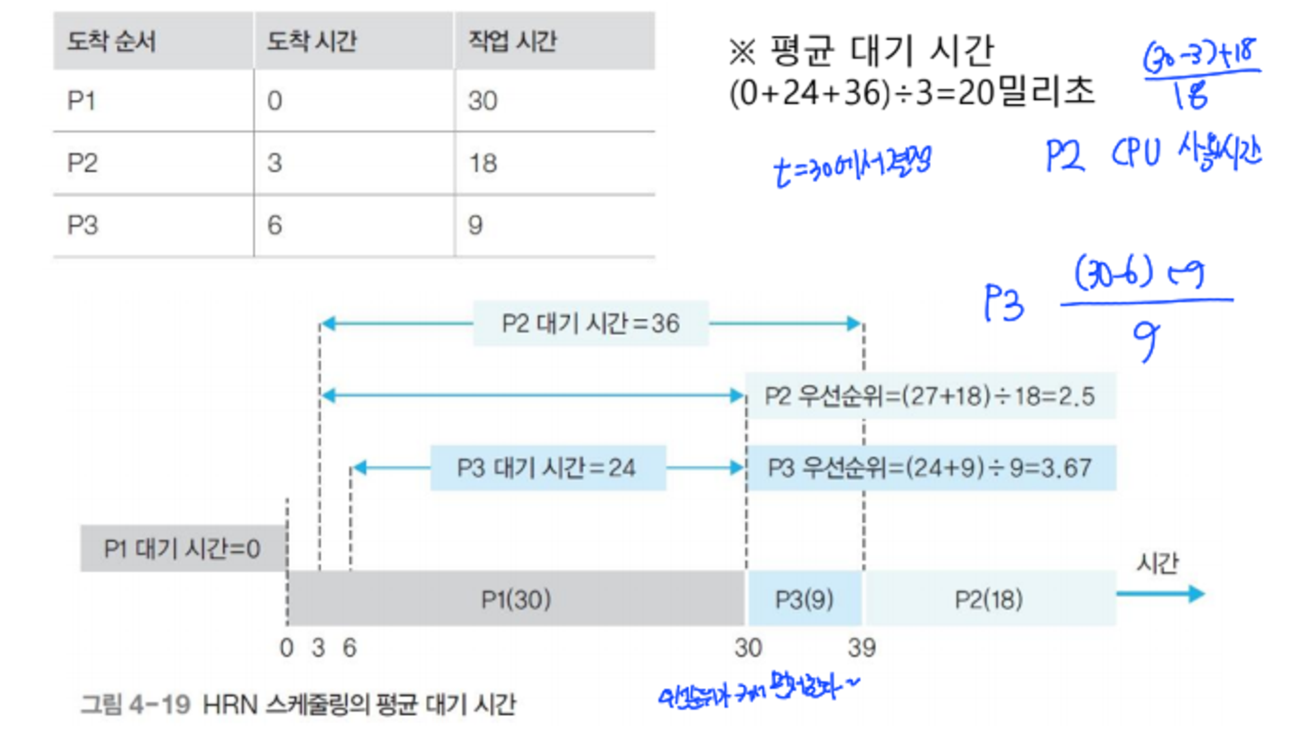 - (비선점형 방식) HRN 스케줄링 : 작업 시간이 짧거나 대기 시간이 긴 프로세스에 높은 우선순위를 부여