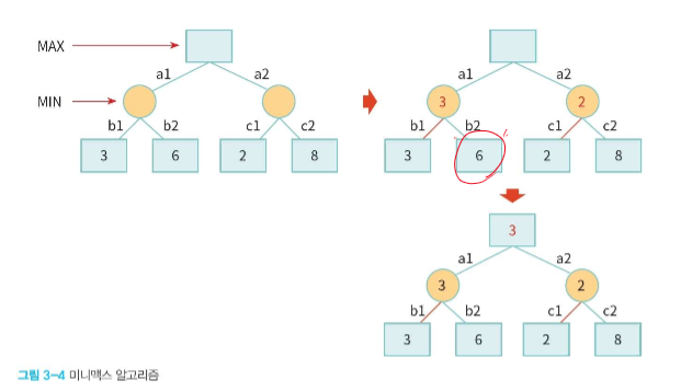 - MAX는 평가 함수 값이 최대인 자식 노드를 선택하고 MIN은 평소 함수 값이 최소인 자식 노드를 선택