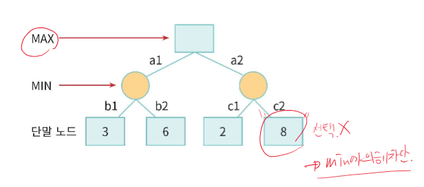 - MAX는 평가 함수 값이 최대인 자식 노드를 선택하고 MIN은 평소 함수 값이 최소인 자식 노드를 선택