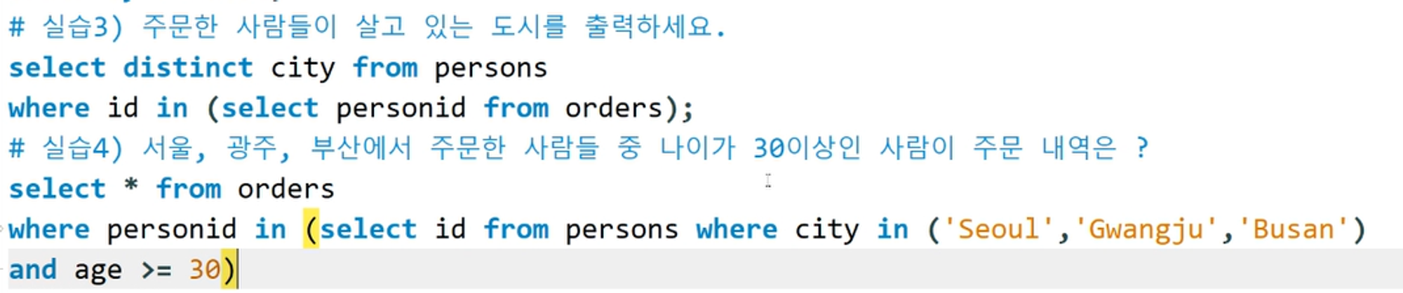 - 예제1) Persons테이블에 서울, 부산, 광주 인 사용자를 출력하세요. select * from Persons where City IN ('Seoul','Busan','Gwangju');